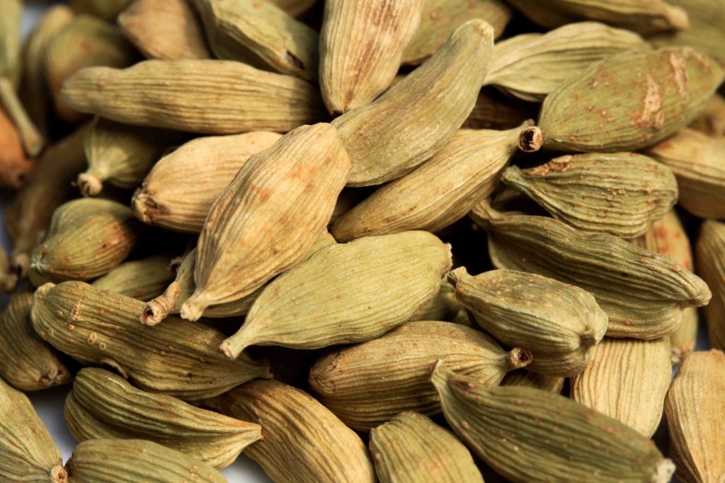 - Cardamom: Green, never bleached white, plump pods